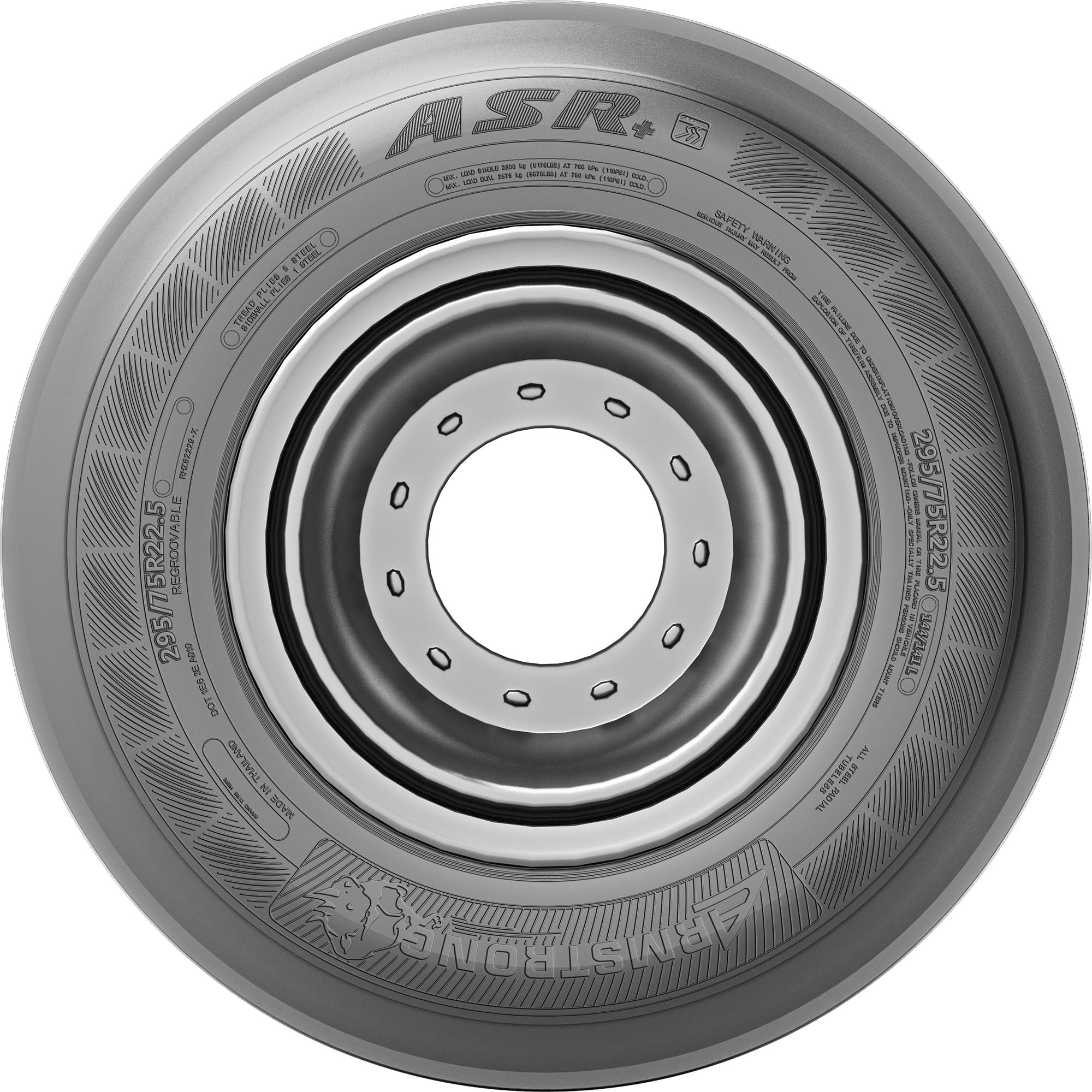 A steer axle tire designed exclusively for regional pickup and delivery applications with solid shoulders to help even wear while providing precise steering and maneuvering ability, the ASR+ from Armstrong features optimized siping on inner ribs to improve handling and traction, and groove bottom protectors to prevent stone drilling and retention. Designed for use on the steer axle in regional pickup and delivery applications SmartWay verified Groove bottom protectors prevent stone drilling and retention Solid shoulders help to promote even wear while delivering precise steering and maneuvering ability Optimized siping on inner ribs improves handling and yields excellent traction info: Specifications Tire Size 255/70R22.5 140/137L H Brand Armstrong