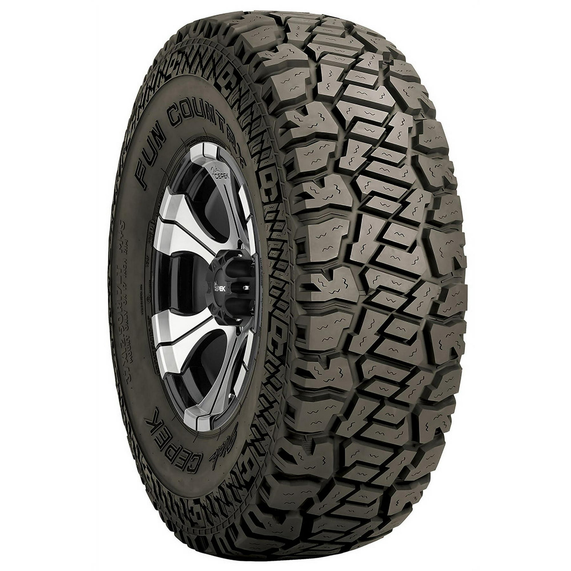 The Fun Country was developed using unique technology and engineering to deliver excellent off-road traction, a quieter ride and superior durability. A unique tread pattern and design, circumferential grooves, stone ejector ribs, and a tough shoulder and sidewall design make this tire one of the best all-terrain tires in the line. The Hybrid All-Terrain tire with a 45,000 Mile Warranty! Uniquely designed interlocking tread lugs feature narrow sipes for exceptional surface grip. Wide alternating tread grooves work with tread design for a firm contact patch that responds to changing terrain. Computer-optimized pitch sequence in the tread delivers a quieter ride on the street. Reinforced three-ply sidewall features the Dick Cepek alternating. Sidebiters? making the tire more puncture resistant. NEW compound offers improved cut and chip protection. The FUN COUNTRY is mud and snow (M+S) rated. Specifications Features Uniquely designed interlocking tread lugs feature narrow sipes for exceptional surface grip Tire Size 37X12.50R20 Vehicle Type Light Truck Tire Width 12.5″ Wheel Diameter 20 Warranty Distance 45000 miles Tire Season All-Season Tire Speed Rating P Tire Type Light Truck Tires Tire Load Index 126 Uniform Tire Quality Grade (UTQG) 0 Tire Traction Rating A Tread Depth 19/32 Brand Dick Cepek Assembled Product Weight 77 lb Model FUN COUNTRY Manufacturer Part Number 90000001936 Manufacturer Dick Cepek Assembled Product Dimensions (L x W x H) 36.70 x 36.70 x 12.50 Inches