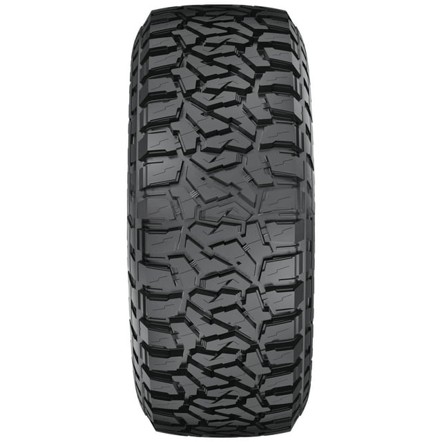 - Rugged-terrain tire with aggressive angled tread blocks, sidewall biters, and scalloped shoulders