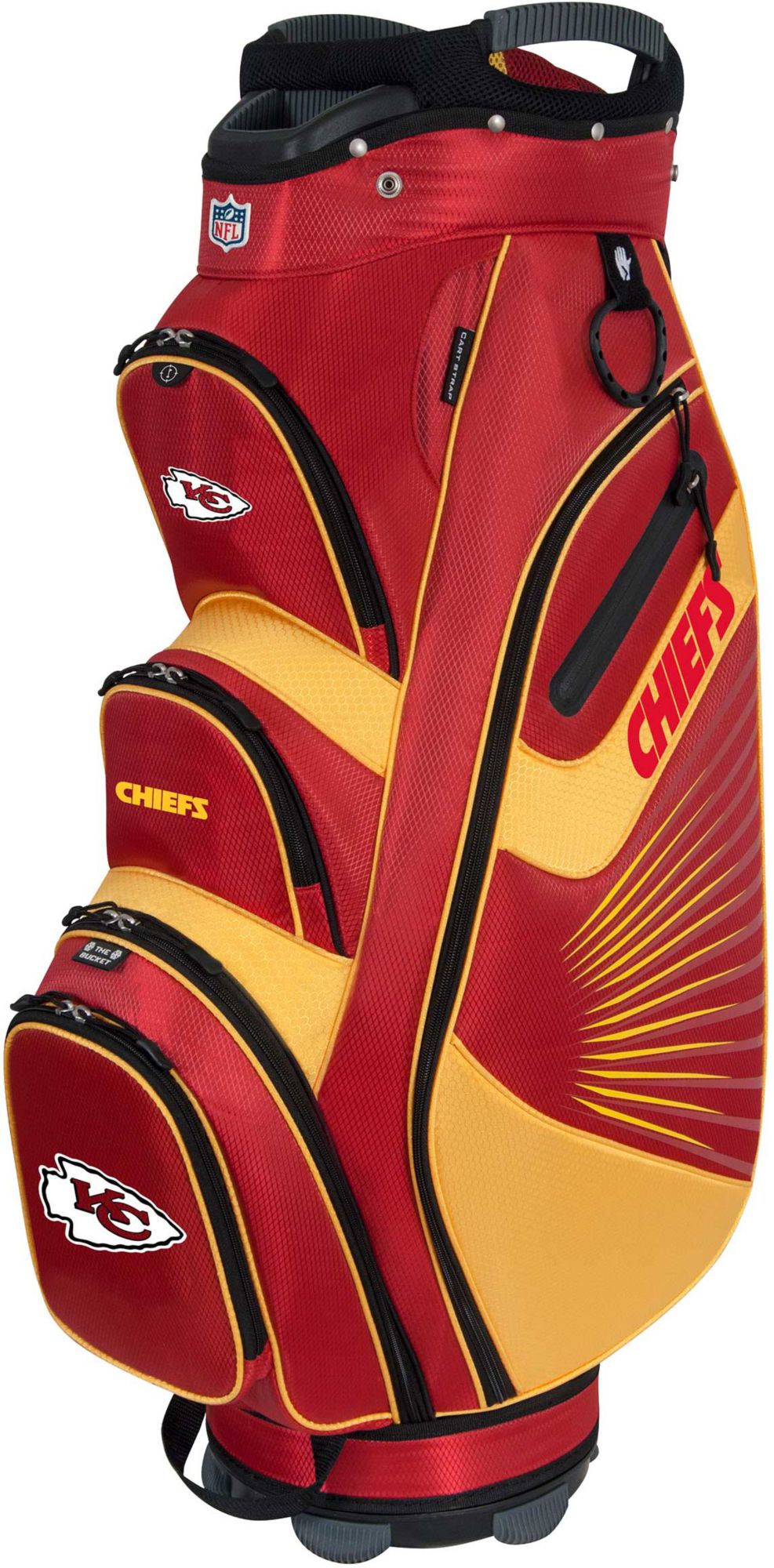 Sport your team colors while staying hydrated on the links with the Team Effort Kansas City Chiefs Bucket II Cooler Cart Bag. Boasting team colors and logos, this cart bag features a 14-way top with a front putter well for superior organization and The Bucket™ insulated thermal-lined beverage compartment with an integrated drainage port keeps your drinks cold without flooding your bag. Numerous pockets, including a velour-lined valuables pocket, dual full-length apparel pockets and a dedicated rangefinder pocket for easy-access, keep gear organized and secure.